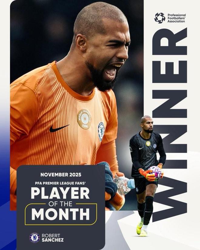 官方消息,切尔西门将罗伯特-桑切斯当选PFA(英格兰职业足球运动员协会)英超球迷评选的11月最佳球员。